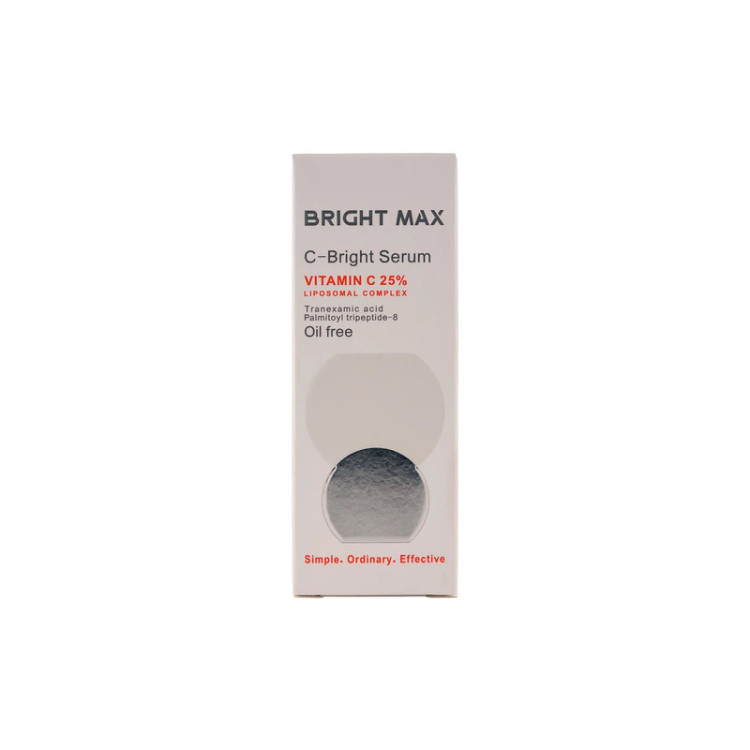 سرم ویتامین c برایت مکس حاوی 25 درصد کمپلکس ویتامین سی لیپوزومال، ترانگزامیک اسید، پالمیتویل تری پپتید 8 و سایر ترکیبات کمک کننده به جذب ویتامین سی است. سرم ویتامین سی برایت مکس فاقد چربی و مناسب انواع پوست است.