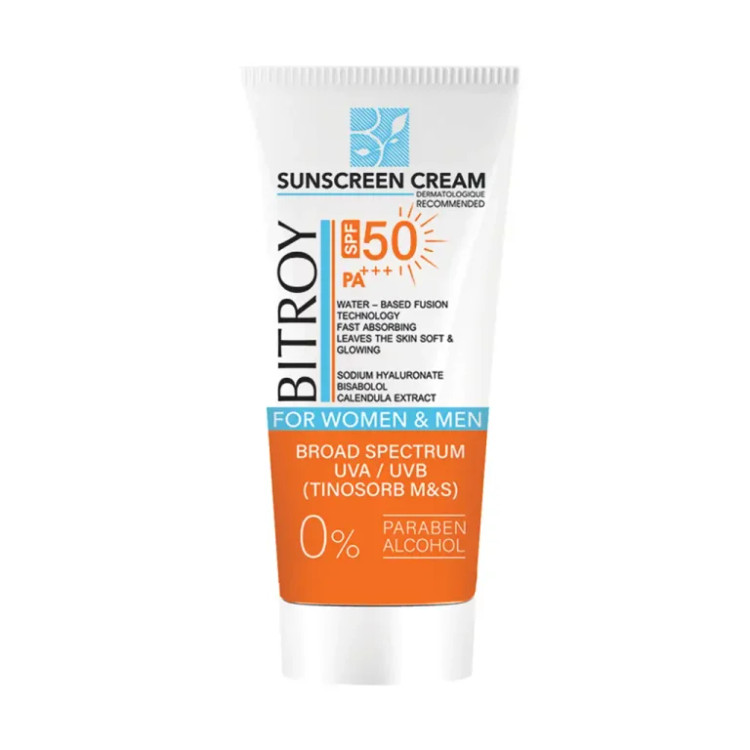 کرم ضد آفتاب بی رنگ پوست خشک و نرمال بیتروی BITROY sunscreen cream for dry and normal skin SPF50 ساخته شده بر پایه آب دارای بافتی سبک و بدون اثر چربی روی پوست می باشد که به سرعت جذب می شود و با دارا بودن SPF50 از پوست در برابر طیف وسیعی از اشعه های مضر UVA و UVB محافظت می کند .