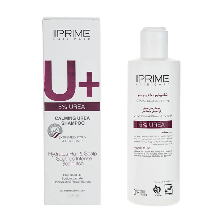 شامپو پریم u+ به واسطه داشتن عصاره گل هانی ساکل و روغن دانه چیا (سرشار از امگا3) می تواند در حفظ رطوبت و کاهش خارش پوست سر موثر واقع شود. شامپو اوره ۵ درصد پریم، در واقع یک شوینده روزانه ملایم برای پوست سر بسیار خشک و دارای خارش است و موها را ابریشمی و درخشان می کند.