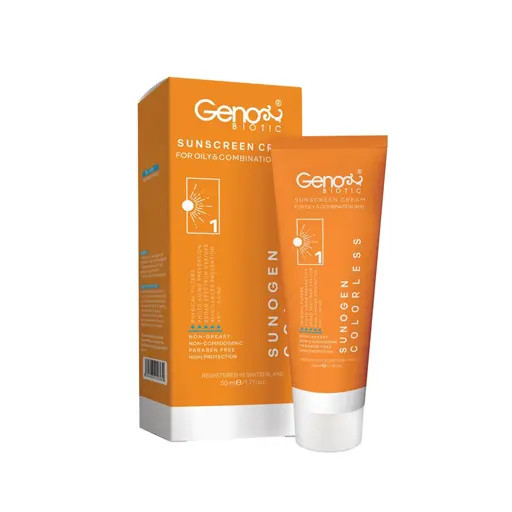کرم ضد آفتاب بی رنگ پوست های چرب و مختلط SPF50 ژنوبایوتیک دارای بافت سبک و فاقد چربی بوده و برای پوست های چرب، مختلط و مستعد آکنه مناسب است. این ضد آفتاب با دارا بودن فیلترهای UV و همچنین مواد موثره گیاهی، نقش موثری در مهار اثرات مضر پرتوهای UVA و UVB دارد و به خوبی از پوست صورت محافظت می کند. این محصول ضد آب و تعریق است و ضمن پوشش کامل، از التهاب، لک، انسداد و تشکیل آکنه روی پوست جلوگیری می کند. دوام و ماندگاری طولانی مدت، حفظ رطوبت در لایه اپیدرم پوست و پیشگیری از پیری زودرس آن از دیگر اثرات کرم ضد آفتاب سانوژن ژنوبایوتیک به شمار می آید.