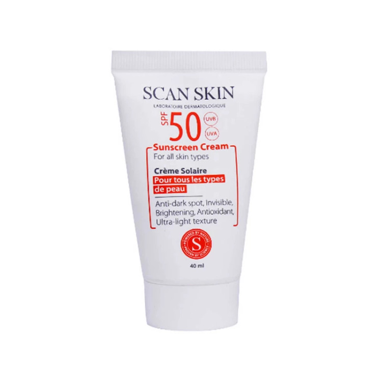 کرم ضد آفتاب بدون رنگ اسکن اسکین مدل SPF50 محافظ UVA ،UVB، ضد لک، روشنکننده، مناسب انواع پوست حجم 40 میلیلیتر